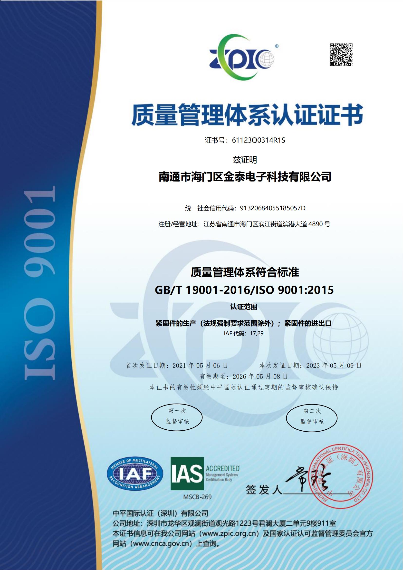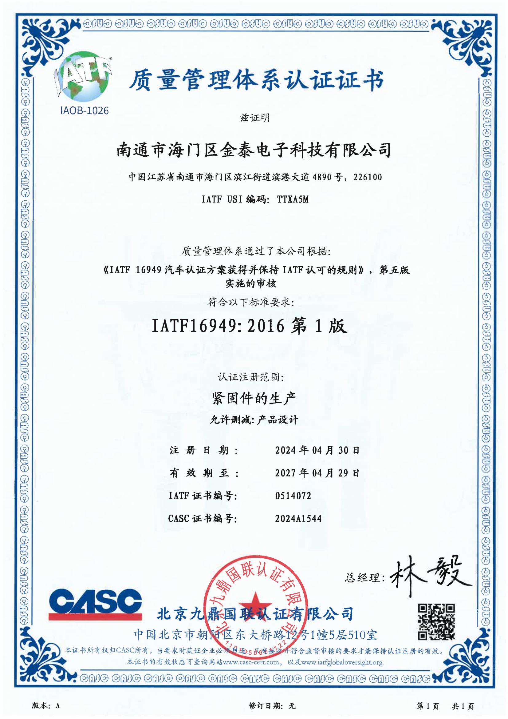 金泰緊固件獲得專業(yè)認(rèn)證